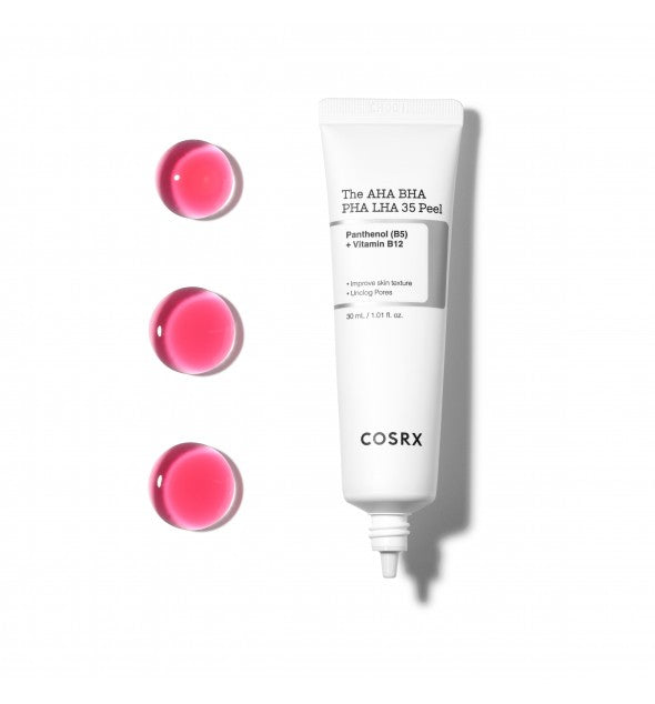 Le gel exfoliant AHA BHA PHA LHA 35 Peel de COSRX affine le grain de peau, resserre les pores et illumine le teint grâce à sa formule puissante à 35 % de multi-acides. Idéal pour les utilisateurs habitués aux acides, il élimine les cellules mortes, réduit l'excès de sébum et unifie la peau. Enrichi en acide hyaluronique, allantoïne et vitamines B12, B5 et E, il hydrate, apaise et renforce la barrière cutanée. Sa texture gel rose fluide offre une exfoliation efficace tout en laissant la peau douce, lisse et éclatante.